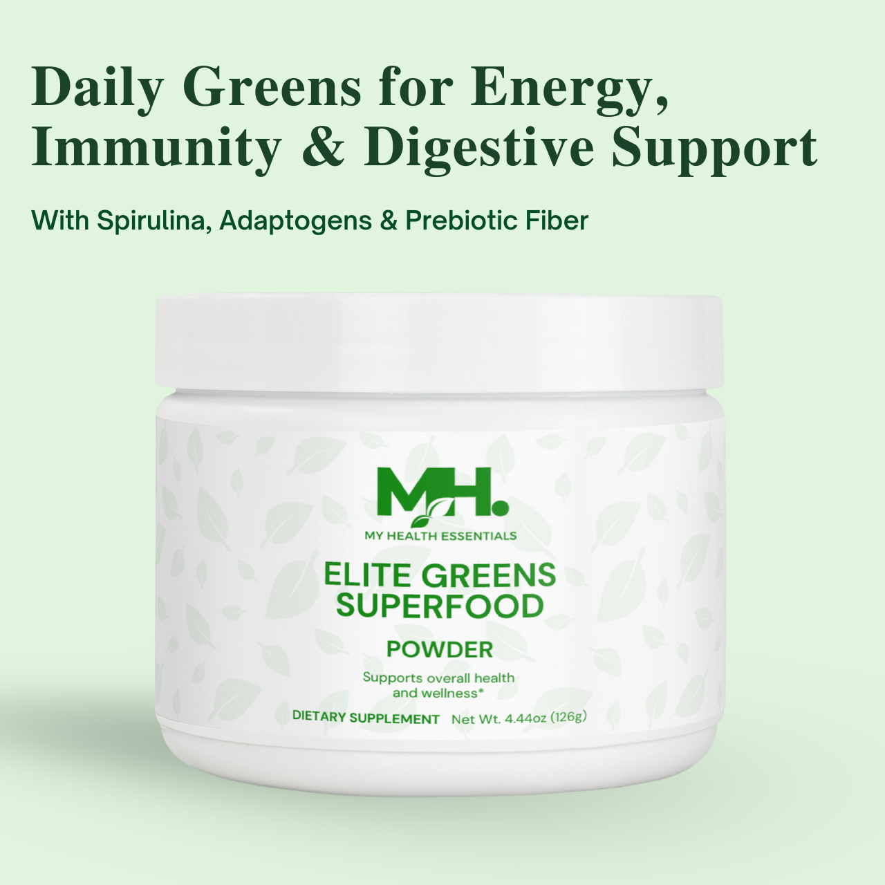 - 🟢 Elite Greens Superfood: 1 scoop daily in water or smoothie for daily energy & digestion